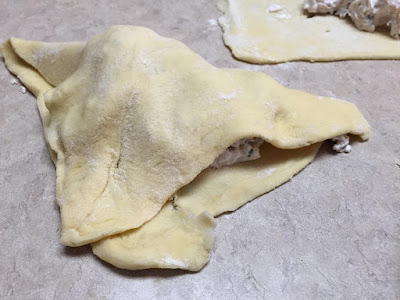 2. Open tubes of crescent rolls and unwind. Pull apart four sections, leaving two triangles together to form a rectangle. Pinch seams of two triangles together. You will have four rectangles per tube of crescent rolls. Flour counter and roll out each section to about a 4x6” size. If you have littles, just use ONE triangle instead of two. This way you will have, say, 6 large packets and 4 small packets.